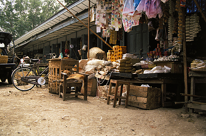 Room 22 - Burma Fotos von Land und Leuten Auf meinen zahlreichen ausgedehnten Reisen durch dieses wunderschöne und faszinierende Land, habe ich auch fotografiert und nicht nur skizziert. Hier in diesem Raum nun eine winzig kleine Auswahl meiner Lieblingsbilder. (Aktuell muß erwähnt werden, dass sich in Burma gerade relativ viel tut.- Oktober 2011 - Es sieht ein klein wenig nach Öffnung aus. In den letzten 20 Jahren war das sporadisch der Fall und jedesmal wurden die Hoffnungen und Erwartungen aufs Schlimmste enttäuscht. Ich hoffe, dass es diesmal etwas besser läuft. Burma [Myanmar] soll ja 2014 den ASEAN-Vorsitz antreten und braucht dringend ein paar Bonuspunkte auf der Menschenrechtsskala. Vielleicht ist dieser äussere Druck ein Anlass, die ersten Kurskorrekturen seit 1962 vorzunehmen.) Ein Hund hält seinen Mittagsschlaf auf einem Markt in Mandalay.