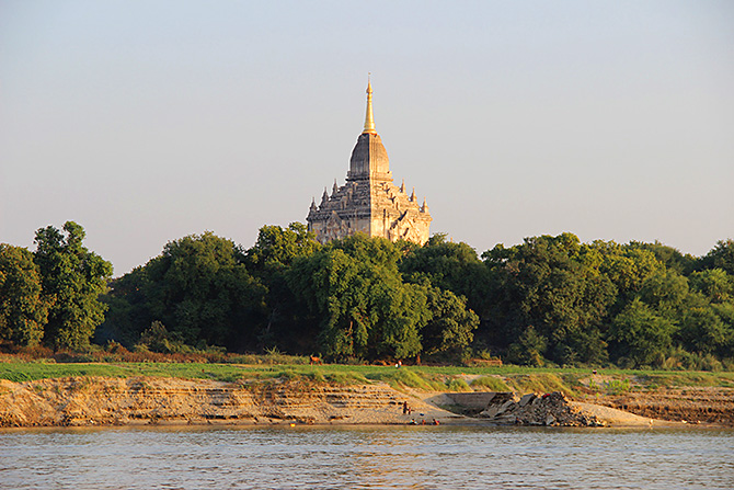 Room 22 - Burma Fotos von Land und Leuten Auf meinen zahlreichen ausgedehnten Reisen durch dieses wunderschöne und faszinierende Land, habe ich auch fotografiert und nicht nur skizziert. Hier in diesem Raum nun eine winzig kleine Auswahl meiner Lieblingsbilder. (Aktuell muß erwähnt werden, dass sich in Burma gerade relativ viel tut.- Oktober 2011 - Es sieht ein klein wenig nach Öffnung aus. In den letzten 20 Jahren war das sporadisch der Fall und jedesmal wurden die Hoffnungen und Erwartungen aufs Schlimmste enttäuscht. Ich hoffe, dass es diesmal etwas besser läuft. Burma [Myanmar] soll ja 2014 den ASEAN-Vorsitz antreten und braucht dringend ein paar Bonuspunkte auf der Menschenrechtsskala. Vielleicht ist dieser äussere Druck ein Anlass, die ersten Kurskorrekturen seit 1962 vorzunehmen.) Gawdapalin Pagode in Bagan vom Irrawaddy gesehen