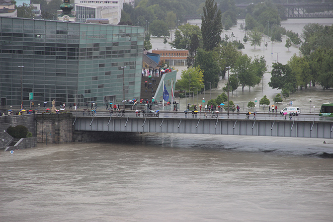 The flood in Linz June 2013 Die zweite Jahrhundertflut in diesem Jahrhundert hat in Linz keine so katastrophalen Schäden angerichtet wie in anderen Orten und Städten. Optisch war das alles sehr eindrucksvoll und gewaltig. Da bin ich dann - wie so viele andere auch - selbstverständlich mit der Kamera ausgerückt und habe eine ganze Menge Fotos vom Hochwasser gemacht. Am 4. Juni 2013. Nibelungenbrücke und das AEC vor dem überschwemmten Jahrmarktgelände