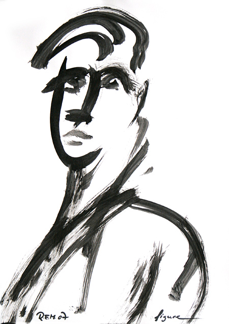 Room 13 - fresh Einige frische Arbeiten. Frisch im Sinne von aktuell. (2007) Mit bekannten und teilweise neuen Materialien und Motiven. Teile von neuen Serien... Eine Zeichnung wurde mit Marker und etwas Rotwein gemacht. Da können Sie sehen, wozu Tannine gut sind. Die farbigen Hochformate in Mischtechnik habe ich großteils mit Acryl und Tusche auf sehr glattes und glänzendes Proofpapier gemalt. Und das rheingauer Huhn, auf dem wirklich kein Tier zu sehen ist, entstand mit Farbstiften, Tusche und Kugelschreiber. Figure 07