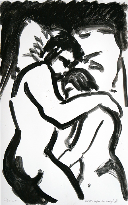 Room 13 - fresh Einige frische Arbeiten. Frisch im Sinne von aktuell. (2007) Mit bekannten und teilweise neuen Materialien und Motiven. Teile von neuen Serien... Eine Zeichnung wurde mit Marker und etwas Rotwein gemacht. Da können Sie sehen, wozu Tannine gut sind. Die farbigen Hochformate in Mischtechnik habe ich großteils mit Acryl und Tusche auf sehr glattes und glänzendes Proofpapier gemalt. Und das rheingauer Huhn, auf dem wirklich kein Tier zu sehen ist, entstand mit Farbstiften, Tusche und Kugelschreiber. Umarmungen im Schlaf 4
