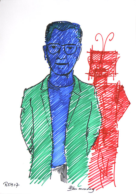 Room 13 - fresh Einige frische Arbeiten. Frisch im Sinne von aktuell. (2007) Mit bekannten und teilweise neuen Materialien und Motiven. Teile von neuen Serien... Eine Zeichnung wurde mit Marker und etwas Rotwein gemacht. Da können Sie sehen, wozu Tannine gut sind. Die farbigen Hochformate in Mischtechnik habe ich großteils mit Acryl und Tusche auf sehr glattes und glänzendes Proofpapier gemalt. Und das rheingauer Huhn, auf dem wirklich kein Tier zu sehen ist, entstand mit Farbstiften, Tusche und Kugelschreiber. Blue Monday