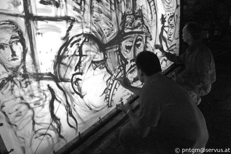 Samstag, 2. 6. 2007, 0 Uhr Im Rahmen der „Sunnseitn“ - Aktion „Geisterstadt 2007“ gemeinsame Malaktion mit meinem Freund und Künstlerkollegen Franz Durst im Atelier Miroslav Páral. Mit fluoreszierenden Farben bemalten wir eine 3 x 2 Meter große Leinwand. Von hinten mit Schwarzlicht beleuchtet und von vorne mit Saxophon (Klaus Gesing) und Cello (Stephan Punderlitschek) begleitet. Live... um die Geisterstunde. Denn „Geisterstadt“ war das Motto der zweitägigen Kunstreise von Linz nach Krumau. Die Fotos stammen von meinem Freund Werner Puntigam. Wir malen Details auf der Vorderseite der Leinwand.