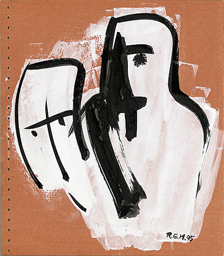 Room 1 - ink brush Eine Auswahl aus der Serie „Kalligrafische Szenen“. Eine Sequenz sehr reduzierter und schnell gemalter, ikonenhafter Szenen. Die gesamte Serie besteht aus 70 Kartons. Die Tafeln sind jeweils 22 x 25 cm groß. Verwendet habe ich Dispersionsfarbe und Tusche. Karton No. 1
