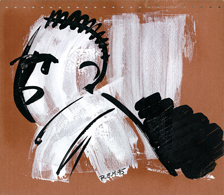 Room 1 - ink brush Eine Auswahl aus der Serie „Kalligrafische Szenen“. Eine Sequenz sehr reduzierter und schnell gemalter, ikonenhafter Szenen. Die gesamte Serie besteht aus 70 Kartons. Die Tafeln sind jeweils 22 x 25 cm groß. Verwendet habe ich Dispersionsfarbe und Tusche. Karton No. 15