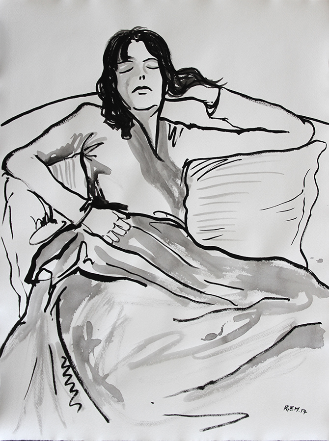 2017 - aktuelle Arbeiten In diesem Raum finden sich nun aktuelle Bilder. Die ersten 6 Stück sind alle mit Acryl auf Leinwand gemalt. Gemeinsam haben sie den Entstehungszeitraum: „Ist das alles?“ malte ich im Dezember 2016, die anderen 5 im Januar 2017. Die weiteren Bilder sind ziemlich frisch und in unterschiedlichen Techniken. While you were sleeping 4, 56 x 75 cm, Tusche auf Büttenpapier
